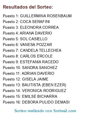 Lista de participantes: GUILLERMINA ROSENBAUM(2 participaciones), ARIANA DAVERIO(2 participaciones), CANDELA TELLECHEA(3 participaciones), DEBORA PULIDO DEMASI, VERONICA RODRIGUEZ(2 participaciones), ESTEFANIA RACEDO(2 participaciones), ELEONORA CORREA(3 participaciones), ADRIAN DAVERIO, BAUTISTA (EBEN EZER), SOL CASIELLO, VANESA POZZAR, COCA SERAFINI, SANDRA SANCHEZ, CARLOS ERCOLE, EMILSE BICHARRA(2 participaciones), GISELA JAIME.