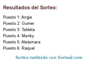 Lista de participantes: Gumer (100), Raquel (100), Manky (100), Angie (100), Aletamara (100), Tableta (100).