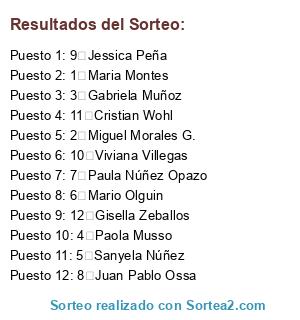 Lista de participantes: 1 Maria Montes , 2 Miguel Morales G. , 3 Gabriela Muñoz , 4 Paola Musso , 5 Sanyela Núñez , 6 Mario Olguin , 7 Paula Núñez Opazo , 8 Juan Pablo Ossa , 9 Jessica Peña , 10 Viviana Villegas , 11 Cristian Wohl , 12 Gisella Zeballos.
