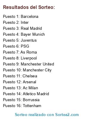 Lista de participantes: Atletico Madrid, Barcelona, Real Madrid, Chelsea, Manchester City, Manchester United, Arsenal, Liverpool, Tottenham, Inter, As Roma, Juventus, Ac Milan, Borrussia, Bayer Munich, PSG.
