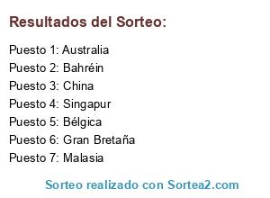 Lista de participantes: Australia, Bahréin, China, Rusia, España, Mónaco, Canadá, Austria, Gran Bretaña, Alemania, Hungría, Bélgica, Italia, Singapur, Malasia, Japón, Estados Unidos, México, Brasil, Abu Dhabi.