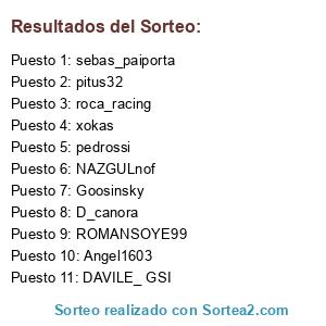 Lista de participantes: pitus32, roca_racing, DAVILE_ GSI, xokas, D_canora, ROMANSOYE99, Angel1603, NAZGULnof, sebas_paiporta, pedrossi, Goosinsky.