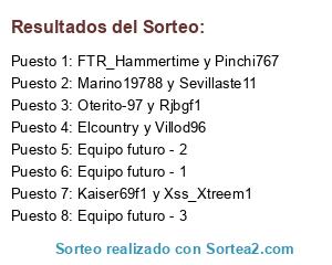 Lista de participantes: Marino19788 y Sevillaste11, Kaiser69f1 y Xss_Xtreem1, FTR_Hammertime y Pinchi767, Oterito-97 y Rjbgf1, Elcountry y Villod96, Equipo futuro - 1, Equipo futuro - 2, Equipo futuro - 3.