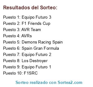 Lista de participantes: Demons Racing Spain, Los Destroyer, Spain Gran Formula, AVR Team, AVRs, F1 Friends Cup, F1SRC, Equipo Futuro 1, Equipo Futuro 2, Equipo Futuro 3.