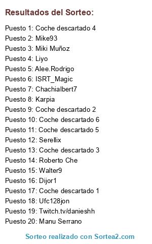Lista de participantes: Liyo, Twitch.tv/danieshh, Karpia, Walter9, Serellix, Ufc128jon, Manu Serrano, Dijor1, ISRT_Magic, Miki Muñoz, Roberto Che, Chachialbert7, Mike93, Alee.Rodrigo, Coche descartado 1, Coche descartado 2, Coche descartado 3, Coche descartado 4, Coche descartado 5, Coche descartado 6.