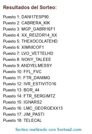Lista de participantes: WILLIAMS_NARDY, JAVIER_VERA02, FTR_IVANSITOOF1, ELREYGUIRI, ABRAAHAM123XD, RAYMANX14, MGP_HUERTA29, FTR_VIFER, VGIA_ALVAROAZNAR, IVR_MAGIC, XXJOSE_ORENESXX, FFL_XXRAMIRYNXX, FFL_LIYO, MRO_TONECHO, IVR_MARQUEZ_F1, PABLETON1204, VSL_LUMOCRE, FFL_SKW.