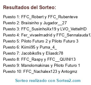 Lista de participantes: FFC_SusiinhoXx19 y LVO_VettelHD, FFC_Robert y FFC_Rubenteve, FFC_Nachalex123 y Antogmz, FFC_Raspy y FFC__QUINI13, Kiimii95 y Puma_4_, Fer_vivaelmadrid y FFC_Sennalauda12, Manolomakinas y Piloto Futuro 1, Braiisinho y Jugador__27, Jacobiko9s y Eliasdc78, Piloto Futuro 2 y Piloto Futuro 3.