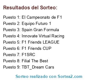 Lista de participantes: Spain Gran Formula, Innovate Virtual Racing, F1 Friends LEAGUE, TBT_Dream Cars, F1 Friends CUP, El Campeonato de F1, F1SRC, Filial The Best, Equipo Futuro 1.