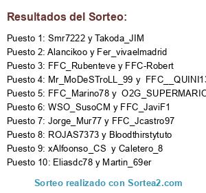 Lista de participantes: ROJAS7373 y Bloodthirstytuto, Jorge_Mur77 y FFC_Jcastro97, Eliasdc78 y Martin_69er, WSO_SusoCM y FFC_JaviF1, FFC_Rubenteve y FFC-Robert, xAlfoonso_CS y Caletero_8, Alancikoo y Fer_vivaelmadrid, Mr_MoDeSTroLL_99 y FFC__QUINI13, Smr7222 y Takoda_JIM, FFC_Marino78 y O2G_SUPERMARIO.