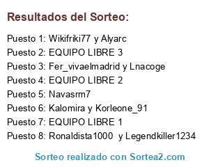 Lista de participantes: Fer_vivaelmadrid y Lnacoge, Wikifriki77 y Alyarc, Ronaldista1000 y Legendkiller1234, Kalomira y Korleone_91, Navasrm7, EQUIPO LIBRE 1, EQUIPO LIBRE 2, EQUIPO LIBRE 3.