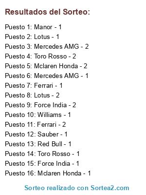 Lista de participantes: Mercedes AMG - 1, Mercedes AMG - 2, Ferrari - 1, Ferrari - 2, Williams - 1, Williams - 2, Red Bull - 1, Red Bull - 2, Force India - 1, Force India - 2, Sauber - 1, Sauber - 2, Toro Rosso - 1, Toro Rosso - 2, Lotus - 1, Lotus - 2, Mclaren Honda - 1, Mclaren Honda - 2, Manor - 1, Manor - 2.