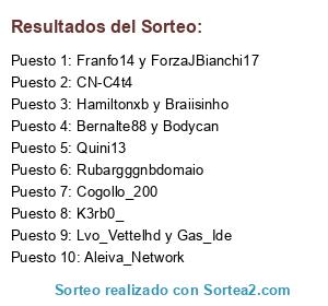 Lista de participantes: Lvo_Vettelhd y Gas_Ide, Franfo14 y ForzaJBianchi17, Hamiltonxb y Braiisinho, Bernalte88 y Bodycan, FTT-F1Magic-ftt, Quini13, Aleiva_Network, Cogollo_200, K3rb0_, CN-C4t4, Rubargggnbdomaio.