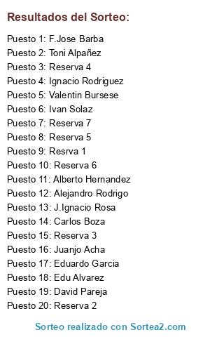 Lista de participantes: Alejandro Rodrigo, Eduardo Garcia, Carlos Boza, Juanjo Acha, Edu Alvarez, Ignacio Rodriguez, David Pareja, Ivan Solaz, Alberto Hernandez, F.Jose Barba, Toni Alpañez, Valentin Bursese, J.Ignacio Rosa, Resrva 1, Reserva 2, Reserva 3, Reserva 4, Reserva 5, Reserva 6, Reserva 7.