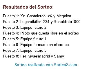 Lista de participantes: Fer_vivaelmadrid y Samy, Legendkiller1234 y Ronaldista1000, Xx_Costaleroh_xX y Megaiva, Equipo formado en el sorteo, Piloto que queda libre en el sorteo, Equipo futuro 1, Equipo futuro 2, Equipo futuro 3.