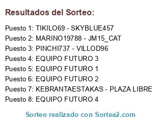 Lista de participantes: KEBRANTAESTAKAS - PLAZA LIBRE, MARINO19788 - JM15_CAT, PINCHI737 - VILLOD96, TIKILO69 - SKYBLUE457, EQUIPO FUTURO 1, EQUIPO FUTURO 2, EQUIPO FUTURO 3, EQUIPO FUTURO 4.