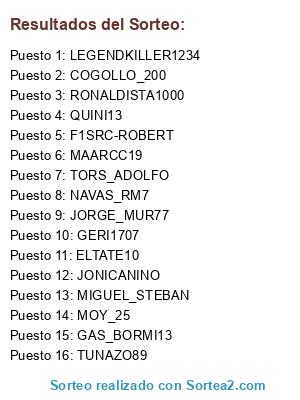 Lista de participantes: JORGE_MUR77, COGOLLO_200, MOY_25, GAS_BORMI13, QUINI13, TUNAZO89, TORS_ADOLFO, JONICANINO, NAVAS_RM7, RONALDISTA1000, F1SRC-ROBERT, MAARCC19, MIGUEL_STEBAN, GERI1707, LEGENDKILLER1234, ELTATE10.