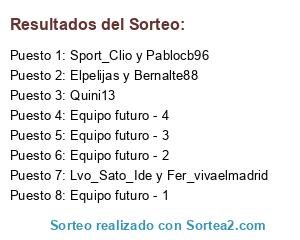 Lista de participantes: Sport_Clio y Pablocb96, Elpelijas y Bernalte88, Quini13, Lvo_Sato_Ide y Fer_vivaelmadrid, Equipo futuro - 1, Equipo futuro - 2, Equipo futuro - 3, Equipo futuro - 4.