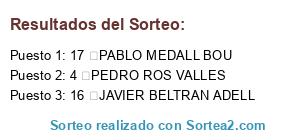 Lista de participantes: 1 JOSE ENRIQUE BOSCA LLOPIS, 2 JAVIER RODRIGUEZ LOPEZ, 3 JUAN RODRIGUEZ LOPEZ, 4 PEDRO ROS VALLES, 5 IVAN MARMOL CABALLER, 6 ANDREU GUTIERREZ FERRANDIZ, 7 DIEGO RIPOLL SOLER, 8 HECTOR SUBIRATS QUEROL, 9 FRANCISCO LLOPIS LOZANO, 10 JOSE RAMIREZ CABALLERO, 11 SERGIO TOMICO MARTIN, 12 PABLO ALMANSA MARIN, 13 RAUL PEREZ SERRA, 14 CARLOS GRACIA LAZARO, 15 CESAR ULIAQUE PINA, 16 JAVIER BELTRAN ADELL, 17 PABLO MEDALL BOU, 18 JAVIER FERNANDEZ ALONSO, 19 IVAN PEÑA IBORRA, 20 VICENT FERRAGUT VEGA, 21 LUIS LAFARGA MARTINEZ, 22 IAN BAQUERIN FORNIES, 23 JOAQUÍN MUÑIO SANCHEZ, 24 JOSEP COSTA CATALA, 25 CARMEN LIDON ROMERO PASCUAL, 26 RAUL GONZALEZ PARDAL, 27 JUAN MARIA BELTRAN FERRER, 28 JAVIER PITARCH TRONCHO, 29 FERMIN AGUILAR CENTELLES, 30 MIGUEL ESPADA PÉREZ.