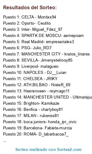Lista de participantes: CHELSEA - JRIKY, MANCHESTER CITY - kratos_linares, CELTA - Montixx94, SPARTK DE MOSCU- aemepoam, NAPOLES - DJ__Luian, MANCHESTER UNITED - Ultimatejuanma, ATH.BILBAO - NisteR_69, MILAN - rubenss81, MALAGA- topotencia, BORUSSIA DORTMUND- Calvotainas, ATLETICO DE MADRID- LUISKAYAZA, PSG- Julio_RD7, VAELNCIA - lalillo46, ROMA- D_labarbacoa7_, ARSENAL - sefis_10, Benfica - charlyboy81, REAL SOCIEDAD - barroso_ceuta, Brighton- Kamikaze, Heerenveen - reymago11, Oporto- Ceutito, boca juniors- honda_ipr_civic, SEVILLA- Jimenystelrooy85, Barcelona- Fabiete-murcia, Inter- Miguel_Fdez_97, Shaktar Donest- JuanmaZero, Real Madrid- empresariales3, MONACO- Angelete_7, Liverpool- malagueo.