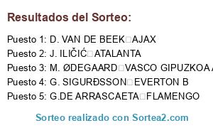 Lista de participantes: G. SIGURÐSSON EVERTON B, G.DE ARRASCAETA FLAMENGO, D. VAN DE BEEK AJAX, J. ILIČIĆ ATALANTA, M. ØDEGAARD VASCO GIPUZKOA AB.