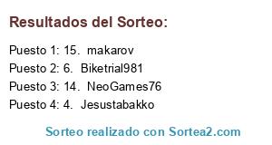Lista de participantes: 1. alvaroaldama92, 2. Wizatek, 3. Manuguer, 4. Jesustabakko, 5. Shiryou, 6. Biketrial981, 7. ruben_cm, 8. Soer, 9. Raz0neR, 10. Repente, 11. sifou, 12. JRodrigo, 13. SusoINC, 14. NeoGames76, 15. makarov, 16. toyosan, 17. Sorianillo.