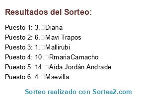 Lista de participantes: , 1. Mallirubi, 2. M. Pilar, 3. Diana, 4. Msevilla, 5. Nerea González, 6. Mavi Trapos, 7. Maria Rosa, 8. Luisa 9804, 9. Inmicabis, 10. RmariaCamacho, 11. Pilar Gil Costa, 12. Pilar Castillo Porras, 13. Ladyencarni, 14. Aída Jordán Andrade.