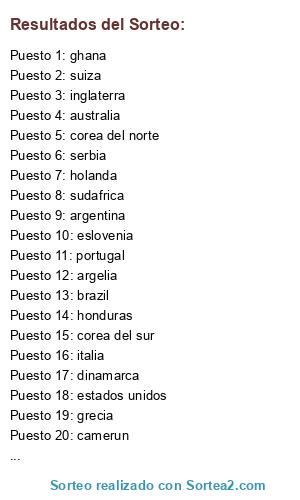Lista de participantes: inglaterra, grecia, costa de marfil, mexico, eslovenia, alemania, holanda, españa, japon, dinamarca, estados unidos, eslovaquia, honduras, corea del sur, italia, paraguay, nueva zelanda, uruguay, francia, portugal, suiza, australia, chile, corea del norte, argelia, camerun, ghana, argentina, brazil, sudafrica, serbia, nigeria.