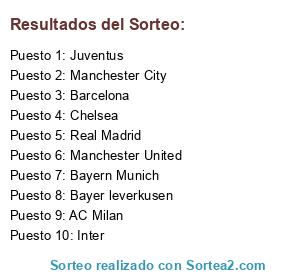 Lista de participantes: Barcelona, Bayern Munich, Real Madrid, Manchester City, Manchester United, AC Milan, Inter, Juventus, Bayer leverkusen, Chelsea.