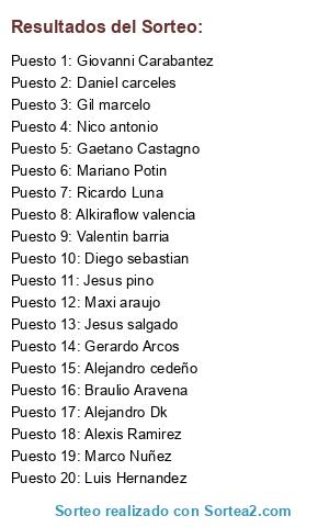 Lista de participantes: Ricardo Luna , Jesus salgado , Daniel carceles , Giovanni Carabantez , Maxi araujo , Valentin barria , Braulio Aravena , Gerardo Arcos , Jesus pino , Luis Hernandez , Nico antonio , Mariano Potin , Gil marcelo , Alejandro Dk , Alexis Ramirez , Gaetano Castagno , Alkiraflow valencia , Alejandro cedeño, Marco Nuñez , Diego sebastian, .