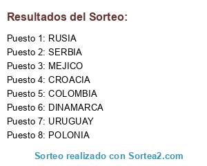Lista de participantes: COLOMBIA, CROACIA, MEJICO, POLONIA, RUSIA, URUGUAY, SERBIA, DINAMARCA.