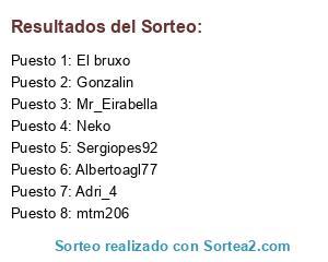 Lista de participantes: Gonzalin, Mr_Eirabella, mtm206, Albertoagl77, El bruxo, Sergiopes92, Adri_4, Neko.
