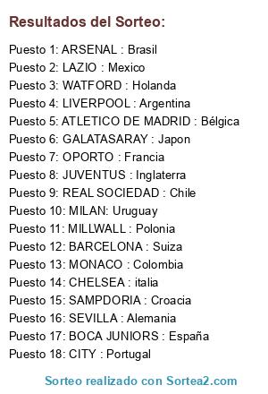 Lista de participantes: BARCELONA : Suiza, WATFORD : Holanda, REAL SOCIEDAD : Chile, ARSENAL : Brasil, JUVENTUS : Inglaterra, MILLWALL : Polonia, MONACO : Colombia, ATLETICO DE MADRID : Bélgica, CITY : Portugal, GALATASARAY : Japon, LIVERPOOL : Argentina, OPORTO : Francia, SAMPDORIA : Croacia, CHELSEA : italia, LAZIO : Mexico, SEVILLA : Alemania, BOCA JUNIORS : España, MILAN: Uruguay.