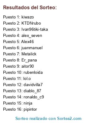 Lista de participantes: lol.o, Metalick, juanmanuel, kiwazo, diablo_87, ronaldo_c9, rubenloida, ninja, alex_seven, aitor90, davidvilla7, Er_pana, Alex46, Ivan96tiki-taka, KTDNrubo, pipintor.
