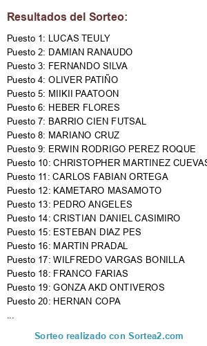Lista de participantes: PEDRO ANGELES, HERNAN COPA, ALVARO RODRIGUEZ, LUCAS TEULY, HUGUITO SOBIERAJ, MARTIN PRADAL, BARRIO CIEN FUTSAL, GONZA AKD ONTIVEROS, ALAN KEN, CARLOS FABIAN ORTEGA, FERNANDO SILVA, OLIVER PATIÑO, WILFREDO VARGAS BONILLA, MARIANO CRUZ, MATIAS ARIAS, FRAN CARP, HEBER FLORES, MIIKII PAATOON, WILSON PATIÑO, CRISTIAN DANIEL CASIMIRO, ESTEBAN DIAZ PES, DIEGO FRANCO, CHRISTOPHER MARTINEZ CUEVAS, ALEJANDRO WACKO, ARIEL APARICIO, ERWIN RODRIGO PEREZ ROQUE, JONATHAN MADRIGAL, FRANCO FARIAS, DAMIAN RANAUDO, JOSE MANUEL HIDALGO CRUZ, KAMETARO MASAMOTO, LICHI DITIERI.