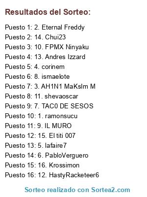 Lista de participantes: 1. ramonsucu, 2. Eternal Freddy, 3. AH1N1 MaKsIm M, 4. corinem, 5. lafaire7, 6. PabloVerguero, 7. TAC0 DE SESOS, 8. ismaelote, 9. IL MURO, 10. FPMX Ninyaku, 11. shevaoscar, 12. HastyRacketeer6, 13. Andres Izzard, 14. Chui23, 15. El titi 007, 16. Krossimon.