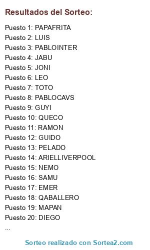Lista de participantes: SAMU, PORTI, JUANJO, QUECO, MAPAN, DIEGO, VASILY, EMER, ARIELLIVERPOOL, GUYI, PABLOCAVS, QABALLERO, RAMON, LEO, PELADO, JABU, NEMO, TOTO, PAPAFRITA, JONI, LUIS, PABLOINTER, GUIDO, FEDE.