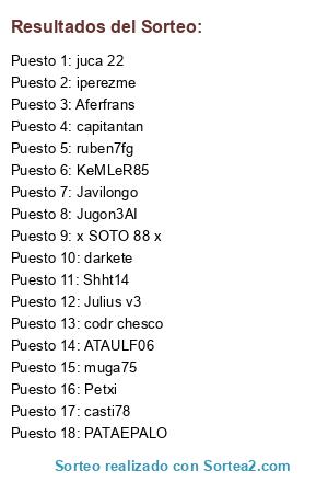 Lista de participantes: Jugon3AI, codr chesco, juca 22, Javilongo, darkete, Julius v3, PATAEPALO, Aferfrans, muga75, capitantan, iperezme, KeMLeR85, ATAULF06, Petxi, x SOTO 88 x, casti78, Shht14, ruben7fg.
