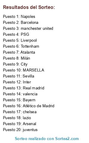 Lista de participantes: Atlético de Madrid, Inter, manchester united, Liverpool, Tottenham, valencia, Napoles, Arsenal, juventus, lazio, Barcelona, Milán, PSG, City, MARSELLA, chelsea, Sevilla, Bayern, Atalanta, Real madrid.