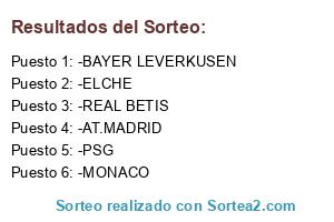 Lista de participantes: -AT.MADRID, -BAYER LEVERKUSEN, -MONACO, -PSG, -ELCHE, -REAL BETIS.