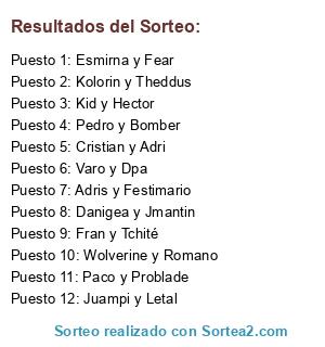 Lista de participantes: Kid y Hector, Pedro y Bomber, Wolverine y Romano, Esmirna y Fear, Adris y Festimario, Varo y Dpa, Fran y Tchité, Juampi y Letal, Kolorin y Theddus, Paco y Problade, Cristian y Adri, Danigea y Jmantin.