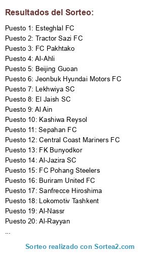 Lista de participantes: Al-Ahli, Al-Ettifaq, Al-Hilal, Al-Hittihad, Al-Nassr, Al-Shabab, Brisbane Roar FC, Central Coast Mariners FC, Al-Gharafa, Al-Rayyan, El Jaish SC, Lekhwiya SC, Beijing Guoan, Guangzhou Evergrande, Guizhou Renhe, Jiangsu Sainty, FC Pohang Steelers, FC Seoul, Jeonbuk Hyundai Motors FC, Suwon Samsung Bluewings FC, Al Ain, Al-Jazira SC, Al-Nasr SC, Al Shabab AAC, Esteghlal FC, Saba Qom FC, Sepahan FC, Tractor Sazi FC, Kashiwa Reysol, Sanfrecce Hiroshima, Urawa Red Diamonds, Vegalta Sendai, Buriram United FC, Muanthong United, FK Bunyodkor, Lokomotiv Tashkent, FC Pakhtako.
