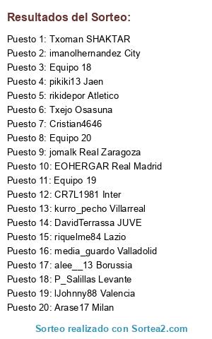 Lista de participantes: DavidTerrassa JUVE, Txoman SHAKTAR, imanolhernandez City, EOHERGAR Real Madrid, kurro_pecho Villarreal, jomalk Real Zaragoza, alee__13 Borussia, P_Salillas Levante, pikiki13 Jaen, rikidepor Atletico, riquelme84 Lazio, media_guardo Valladolid, lJohnny88 Valencia, Arase17 Milan, Txejo Osasuna, Cristian4646, CR7L1981 Inter, Equipo 18, Equipo 19, Equipo 20.