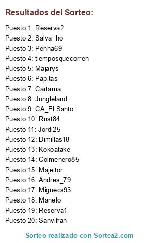 Lista de participantes: Penha69, CA_El Santo, Rnst84, Salva_ho, Majeitor, Kokoatake, Dimillas18, Majarys, Manelo, Miguecs93, Jungleland, Colmenero85, Jordi25, Cartama, Sanvifran, tiemposquecorren, Andres_79, Papitas, Reserva1, Reserva2.