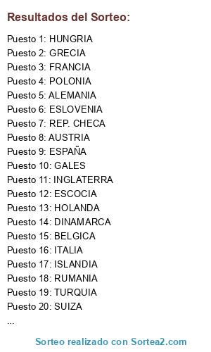 Lista de participantes: HOLANDA, ITALIA, PORTUGAL, ESPAÑA, GRECIA, AUSTRIA, ESLOVENIA, RUSIA, INGLATERRA, ALEMANIA, BELGICA, FRANCIA, ESCOCIA, HUNGRIA, GALES, TURQUIA, SUECIA, SUIZA, DINAMARCA, POLONIA, REP. CHECA, RUMANIA, ISLANDIA, NORUEGA.