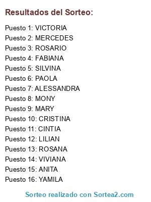 Lista de participantes: SILVINA (8), MONY (4), ROSARIO(8), CINTIA(1), CRISTINA(1), FABIANA(8), PAOLA(4), LILIAN(1), MERCEDES (4), ALESSANDRA(4), VICTORIA(8), YAMILA (1), ROSANA(4), VIVIANA (1), ANITA(1), MARY(4).