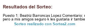 - Ganador: Beatriz Barroncas Lopez Comentario: me enkantaria ir kon mi marido x supuesto pero a mis amigos seguro k les gustaria ir tambien a k si Fanny Barroncas Lopez Sonia Cal Yaiza Peixoto Rodriguez Jesus Bemposta da Silva Natalia de Evaristo Yolanda Fernandez Coto Noemi Ogando Iglesias