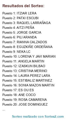 Lista de participantes: PILI ARANDA, MARTA MORENO GONZALEZ, NERA PERAL, ES OU ES, ROSA CAMARENA, PATXI ESCUBI, JORGE GARCIA, RIANNA CALZADOS, ANE COCO, JOSE DOMINGUEZ, EGUZKIÑE ORDEÑANA, ESTIBALIZ MARTINEZ, AITZI PEÑA, RUTH BARREIRO, LORENA Y JAVI MARIAN, JUDIT DEL CAMPO, DEBORAH PARADA, RAQUEL LARRAÑAGA, IZASKUN BILBAO, LAURA PEREZ LARA, ANGELA MARTIN, NEKA LC, SONIA MAZON MARTIN, ITZIAR LERA, CRISTINA MERINO, VANESA CORBACHO, .