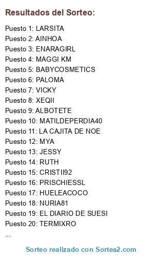 Lista de participantes: NURIA81, AINHOA(2 participaciones), ALBOTETE(2 participaciones), MYA(3 participaciones), VICKY(2 participaciones), ALBA(3 participaciones), HUELEACOCO(2 participaciones), BABYCOSMETICS(3 participaciones), TERMIXRO(3 participaciones), KATERINA(3 participaciones), MAGGI KM(2 participaciones), ANDREA ESTHER(2 participaciones), AFROSITA 501(2 participaciones), YOTAFUCO(2 participaciones), LA CAJITA DE NOE(3 participaciones), PALOMA(2 participaciones), EL DIARIO DE SUESI(2 participaciones), MATILDEPERDIA40(2 participaciones), JESSY(3 participaciones), HARI HARI, GIRLPINK(2 participaciones), ENARAGIRL(3 participaciones), CRISTII92(2 participaciones), RUTH(2 participaciones), PITTUSSIA(2 participaciones), LARSITA, XEQII(3 participaciones), PRISCHIESSL(2 participaciones).