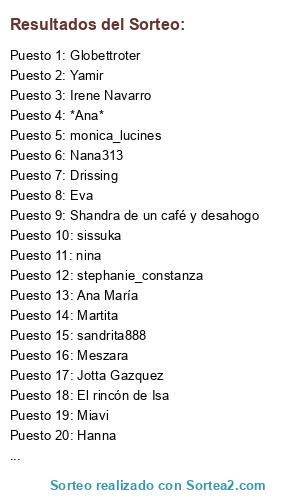 Lista de participantes: Patricia(2 participaciones), Maria Eugenia(3 participaciones), Laura Díaz(3 participaciones), Sabes que existo pero...(3 participaciones), Yamir(2 participaciones), sissuka(3 participaciones), Trihia, Shandra de un café y desahogo(3 participaciones), Abril(2 participaciones), Pitty, Irene Navarro(2 participaciones), Maribel(2 participaciones), morocha_latina(3 participaciones), lety1605(3 participaciones), Becky Torres(2 participaciones), Lagartija poti-poti(3 participaciones), pilar, LOURDES(2 participaciones), Obeblog, Haizeatxu(2 participaciones), Maria del Rocio(2 participaciones), Conchi, My Beauty Chest(2 participaciones), Carmeluxi, Etoilemagike(2 participaciones), Nuria, Hanna, mapeg82, Dulzona(2 participaciones), Isthar(2 participaciones), Yoli MaUp, Isamar, Keren, Byxina BIP(2 participaciones), Noemiya(2 participaciones), Paula voisinfrenos'style(2 participaciones), sandrita888(2 participaciones), Tami*(2 participaciones), Elena(2 participaciones), El rincón de Isa(2 participaciones), Jotta Gazquez(2 participaciones), Flora(2 participaciones), Isabel b(2 participaciones), Xinty(2 participaciones), Crstinika444(2 participaciones), angelsrecio(2 participaciones), Tricia(3 participaciones), Nana313, -Martita-, Laura Blog de Luna, Elenusqui(2 participaciones), Todasguapas(3 participaciones), Maliya(2 participaciones), Maria Jose(2 participaciones), Teresa(2 participaciones), Entrpotis(3 participaciones), Ninfa(2 participaciones), iIusi(2 participaciones), Eva(2 participaciones), logha81(2 participaciones), Dory, stephanie_constanza(2 participaciones), monica_lucines(2 participaciones), Emma(3 participaciones), Ego Makeup(3 participaciones), Rosana Mendez(3 participaciones), simequereisirsen(2 participaciones), ana_lapazzesca, Mak, nina(2 participaciones), Ayna, Purplesky(2 participaciones), Marypect(2 participaciones), Chabelaesp78(2 participaciones), *Ana*(3 participaciones), Beitastyle(2 participaciones), Lumachina, Karo, Anita, Buk(2 participaciones), sorkunde, lilianasf(2 participaciones), Miavi(3 participaciones), Ana María(2 participaciones), Martita(3 participaciones), NuRyaG(2 participaciones), spoylerwoman, Moda Elle, Elenita, Yayels, Ineskj76(2 participaciones), Elena Lostao(2 participaciones), hueleacoco(2 participaciones), Meszara, Marina(2 participaciones), El hada de las...(2 participaciones), MeryyD(2 participaciones), Emmoaist(2 participaciones), Woimbo(2 participaciones), mbparfum(2 participaciones), Olga(2 participaciones), asturianina40(2 participaciones), Miss Dissaster, Eva Enfedaque, Globettroter, Serenity_1975(2sponoemosguapas, Martía(2 participaciones), larsita, Julia(2 participaciones), Mi cesta de maquillaje(3 participaciones), linda, Tamy*(2 participaciones), Amigas makeup(2 participaciones), Cristina(2 participaciones), Elenita"segunda", anilladecarpeta, sastsuma(2 participaciones), laretta, txuka, pinkfluid(3 participaciones), Olga"segunda", chiky(2 participaciones), maye_coqueta, lollifomia, carmen prieto(2 participaciones), Yalmaltiempo...(3 participaciones), Yasmin(2 participaciones), Dianne Tho(3 participaciones), Carole, Makeupandmore(2 participaciones), mayte casado(2 participaciones), ruth(2 participaciones), mariah, Meldewen(3 participaciones), Drissing(3 participaciones), Ana(3 participaciones), tus secretos de belleza, merioajm(2 participaciones), lailavargas(2 participaciones), enbarcelona(2 participaciones).