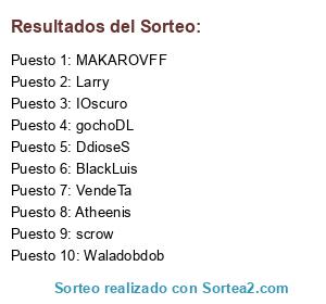 Lista de participantes: LinDuraA, Atheenis, VendeTa, Arkangelxp, DARKJOSUE, DdioseS, scrow, MAKAROVFF, ZeRoCooL7, BlackLuis, VitaminaC, Waladobdob, Larry, BELTRAN, Dominick, xJoelx, Javi, gochoDL, KINKEN, IOscuro, RealTrump, SrPickle.